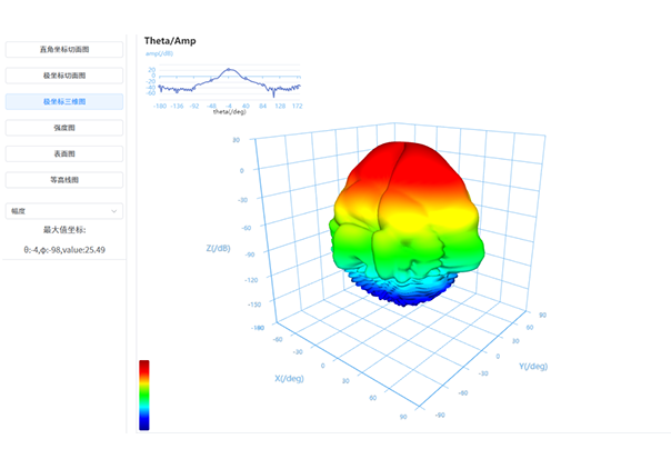 數據分析軟件具(jù)備球麵近遠場變換功能,能夠根據測試方向圖(tú)分析各種極化形式天線的增益、方向(xiàng)性、波束最大點位置(zhì)、波束指向、副瓣電平和(hé)位置(zhì)、波束(shù)寬度、交叉極化等參數;能夠實現多文件比較分析;能夠進行用戶自定義特(tè)殊參數的計算;能(néng)夠自動生成報表並按需打印。