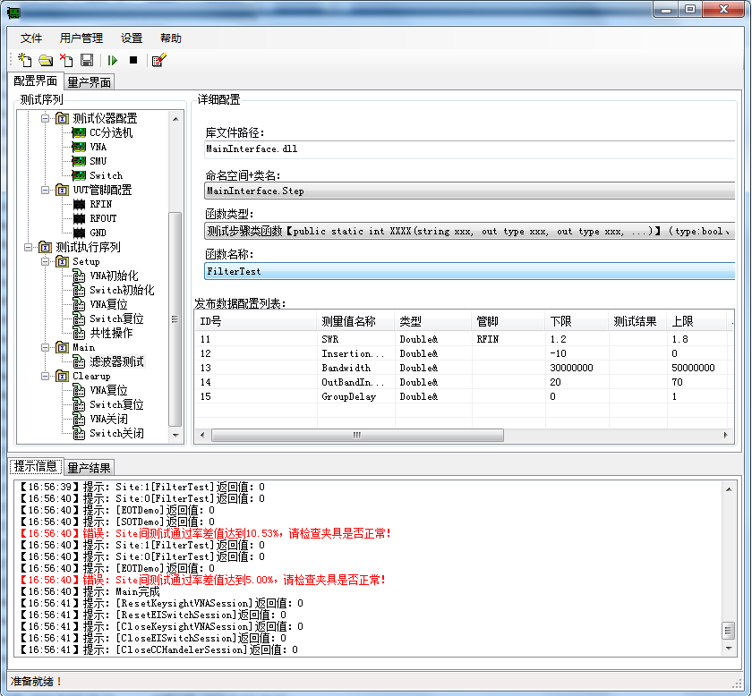 支持多線程高速並發測試。通(tōng)過測試序列模板(bǎn)開發包的支持可快速完成多工位(wèi)並行測試序(xù)列編寫(xiě),期間所涉及的資源爭用(yòng)、調度問題均由軟件平台完成,開發簡潔(jié),執行高效,濾波器測試場景下測試速度可達到20000UPH。