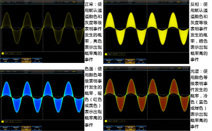 4456係列示波器采用數字熒光三維顯示技術,通過顏色的亮暗或冷暖來表示事件(jiàn)發生的概率,並提供正常、反相(xiàng)、色溫、光譜等4種波形色彩(cǎi),增強了查(chá)看偶(ǒu)發(fā)事件的能力。