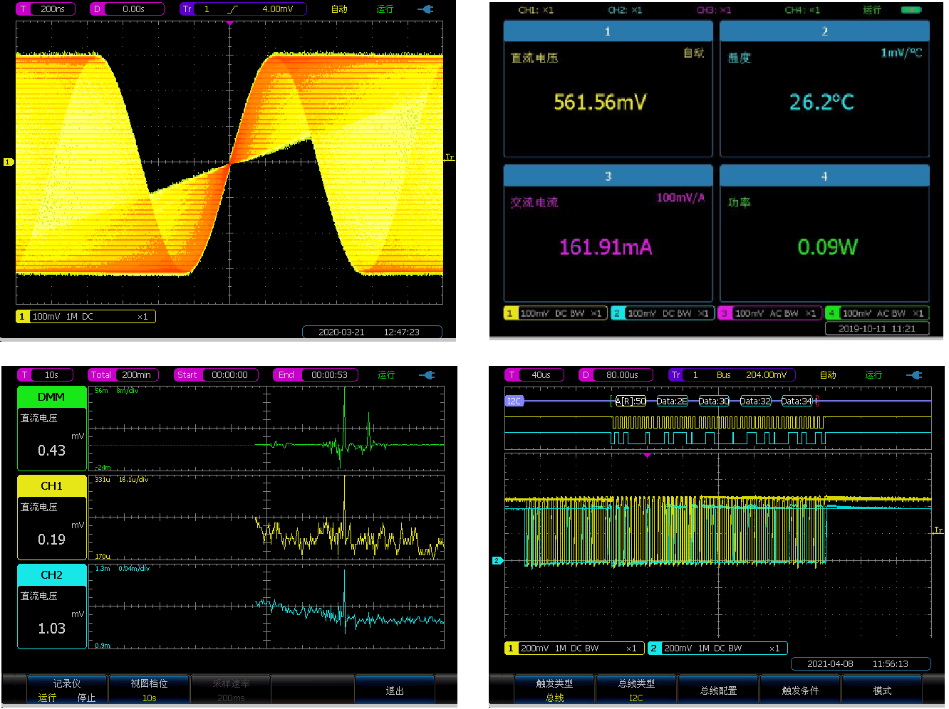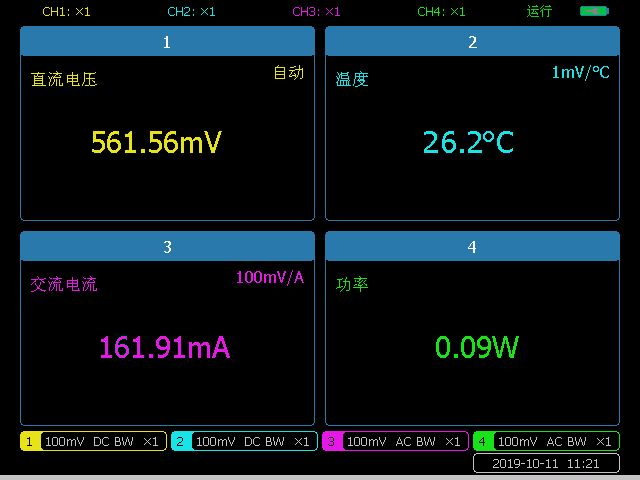 4382B/C/D/E四通道機型數字表功(gōng)能(néng)提供了4個數(shù)字電壓表,具有電壓(yā)、電流(liú)(電流探頭)、溫度(溫度探頭)、功率等的測(cè)量功能,可顯示5位有效數字。數字表複用示波器輸入接口,極大簡化了操作,快速(sù)地解(jiě)決多種模擬量設計與分析(xī)問題。