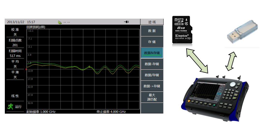 對測(cè)量跡線或(huò)狀(zhuàng)態進行存(cún)儲,存儲介質可選擇儀器(qì)內部FLASH存儲器、SD卡(kǎ)、USB設備。