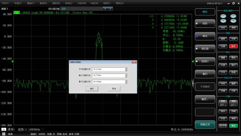 3650係列矢量網絡(luò)分析儀全頻段掃(sǎo)描(miáo),201點,600kHz中頻帶寬情況下掃描速度可達43ms,並(bìng)提供(gòng)一鍵式掃描時間測試功能,方便評估。