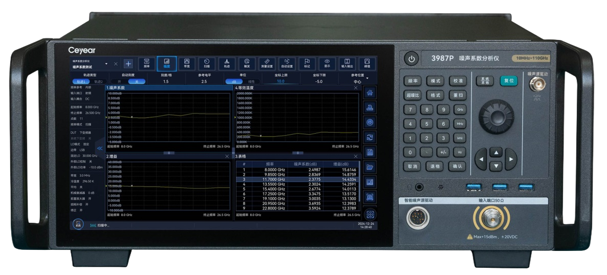 Ceyear 3987噪聲係數分析儀,擁有優異的接收靈敏度,本機噪聲係(xì)數低至4dB,全頻段優於16dB;采用硬件特(tè)性漂移實時校準和誤差修正技術(shù),噪聲係(xì)數測(cè)量不確定度優於0.1dB。不僅可以進行噪聲係數的高精度測試,還可(kě)當作高靈敏度(dù)接收機用於噪聲源定標,是實驗室到(dào)產線(xiàn)理想的測試設備。