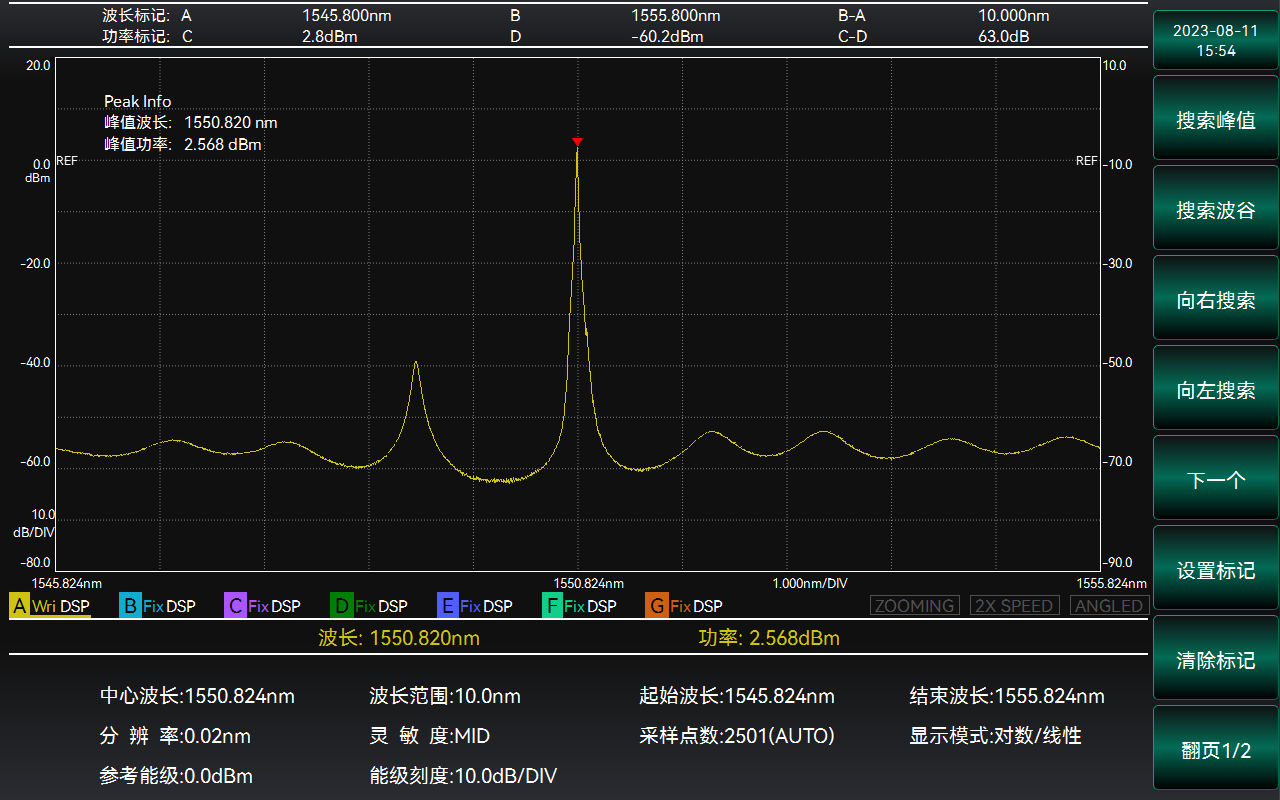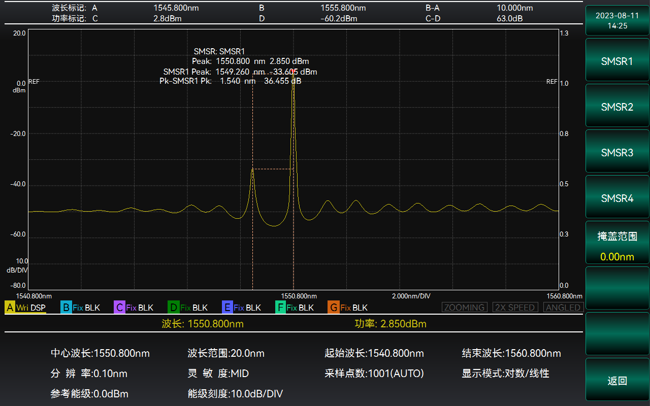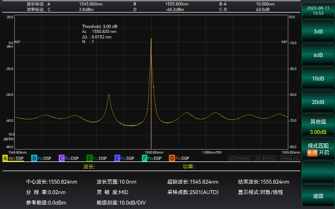 6362D光譜分析儀(光譜儀)具備多場景(jǐng)光譜分析功能,針(zhēn)對DFB-LD等單縱模激光光源,儀(yí)器提供閾值分析和邊模抑製比分析兩種分析方法,有效準確(què)的評估單縱(zòng)模待測光源的中(zhōng)心波長、光譜帶寬和邊模抑製比(bǐ)。