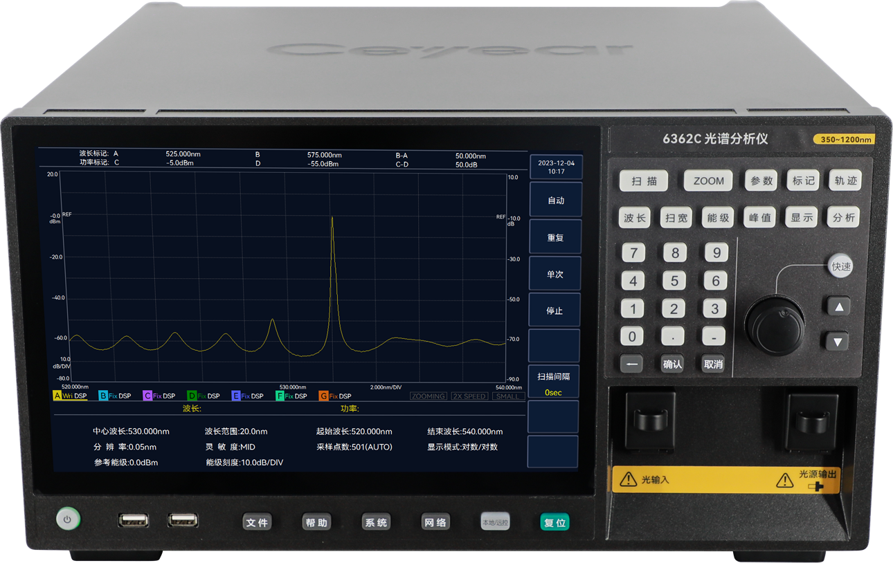6362C是一款高分辨、大動態高速高性能光譜分析儀,適用(yòng)於350nm~1200nm光譜範圍的DWDM等光係統測試;LED、FP-LD、DFB-LD等光有源器件測試;光纖等光無源器件測試。