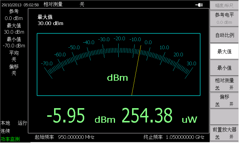 手持式微波綜合測試儀功率檢測(cè)頻(pín)率範圍為100kHz~20GHz,可通過頻譜輸入端口(kǒu)對(duì)被測信號進行功率測量。