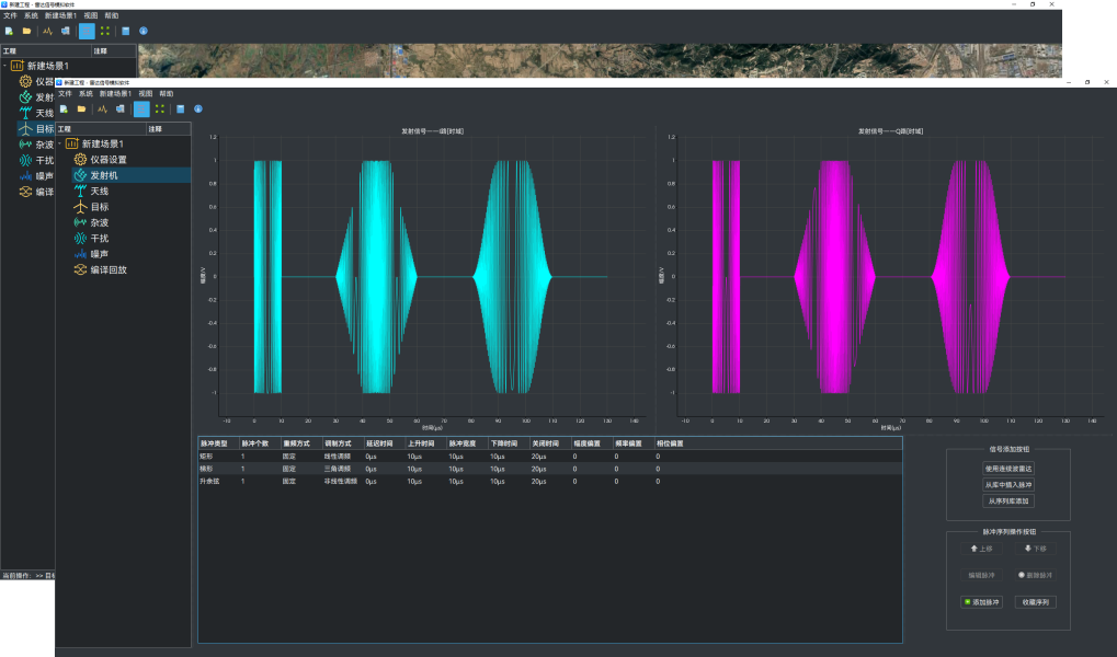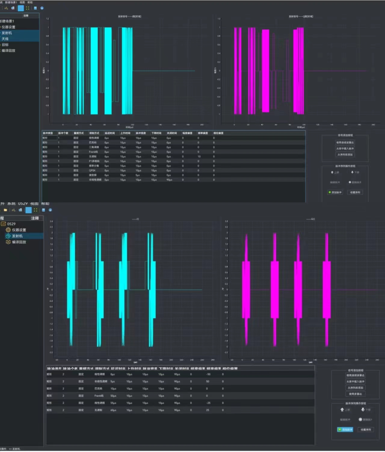 雷達信號模擬軟件支持脈內多(duō)調製及同時到達多脈衝信(xìn)號模擬功能,用戶可以在一個脈衝內添加多(duō)種(zhǒng)調製方式(shì)的雷達信號以及進行多雷達信號同時到達模擬。圖為雷達信號模擬軟件建(jiàn)立的脈內多調製信(xìn)號模擬(nǐ)界麵和多雷達信號同時到達模(mó)擬界麵(miàn),該脈衝信號內部包含多種(zhǒng)雷達信號樣(yàng)式,每種雷達信號具有不同的調製樣式。