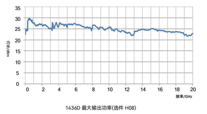 通過選配H08大功率輸出選件,1436A/B/C/D全頻段功率(lǜ)實測值均在20dBm以上;1436F全頻段功率實測(cè)值在17dBm以(yǐ)上,30GHz~40GHz頻段內功率實(shí)測值(zhí)在(zài)20dBm以上。在需要大功率激勵信號的測試場合(hé),使用1436無需外接放(fàng)大器,即可得到所需測試信號。