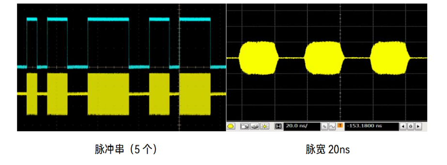 脈衝開關比大於80dB,上升下降時間小於10ns,選用窄脈衝選件H04,最小脈寬20ns,脈(mò)寬範圍(wéi)20ns~42s-10ns,步進10ns,支持門控、外(wài)部等多種觸發(fā)方式。