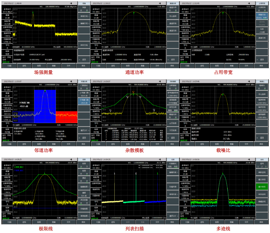多種智能測(cè)量功能:場強測量、通道功率、占(zhàn)用帶寬、鄰道功率、音(yīn)頻解調、載噪比、雜(zá)散模板等