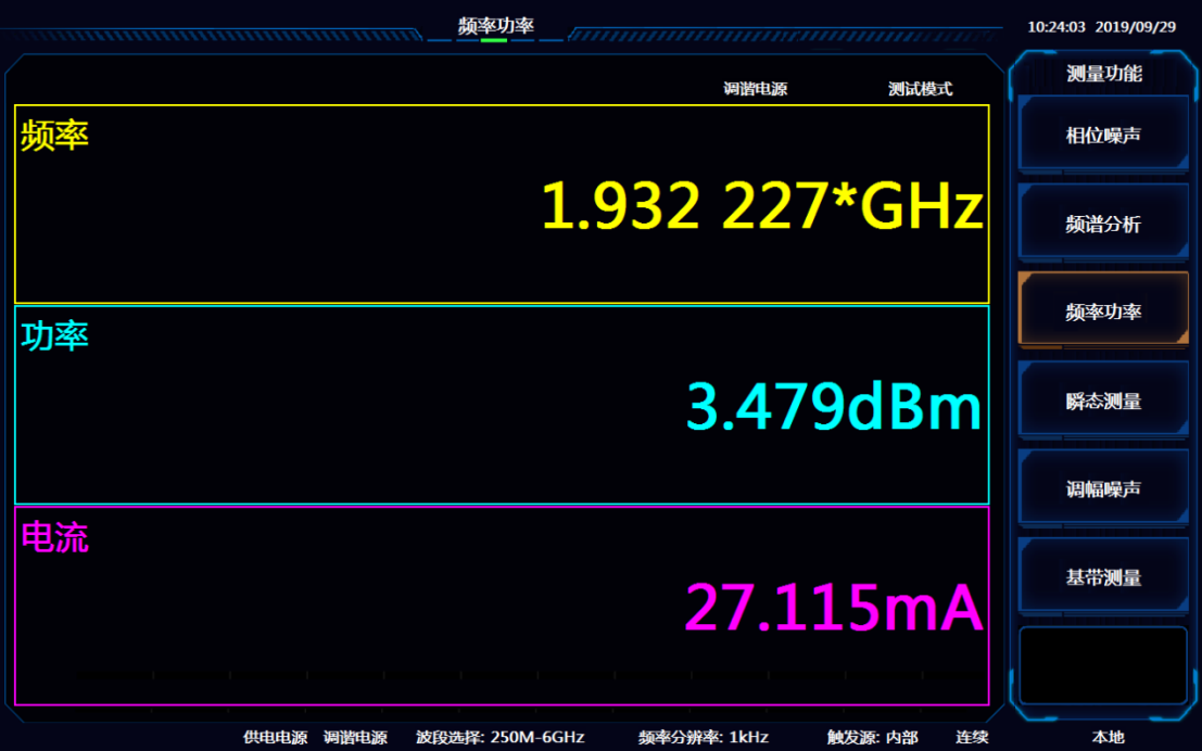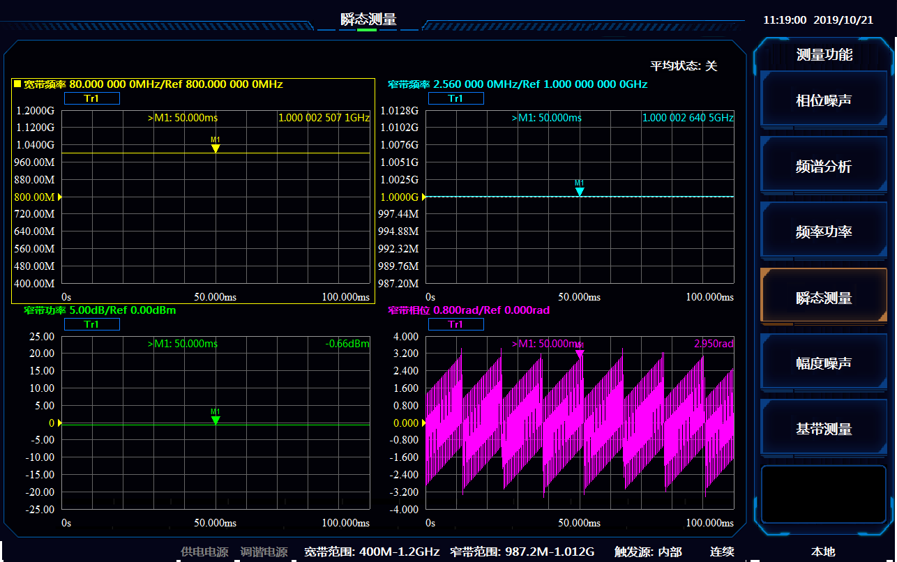 4141係列信(xìn)號源分析儀支持兩(liǎng)種高速無死區的頻率測量(liàng)模式(shì),可以對跳(tiào)頻、捷變頻和(hé)線性調頻等信號進行測量。寬帶模式(shì)可以測量頻率相(xiàng)對於(yú)時(shí)間的變化規律;窄帶模式可以測量功率相對於時間、頻率相(xiàng)對於時間、相位相對於時間的變化規律(lǜ)。