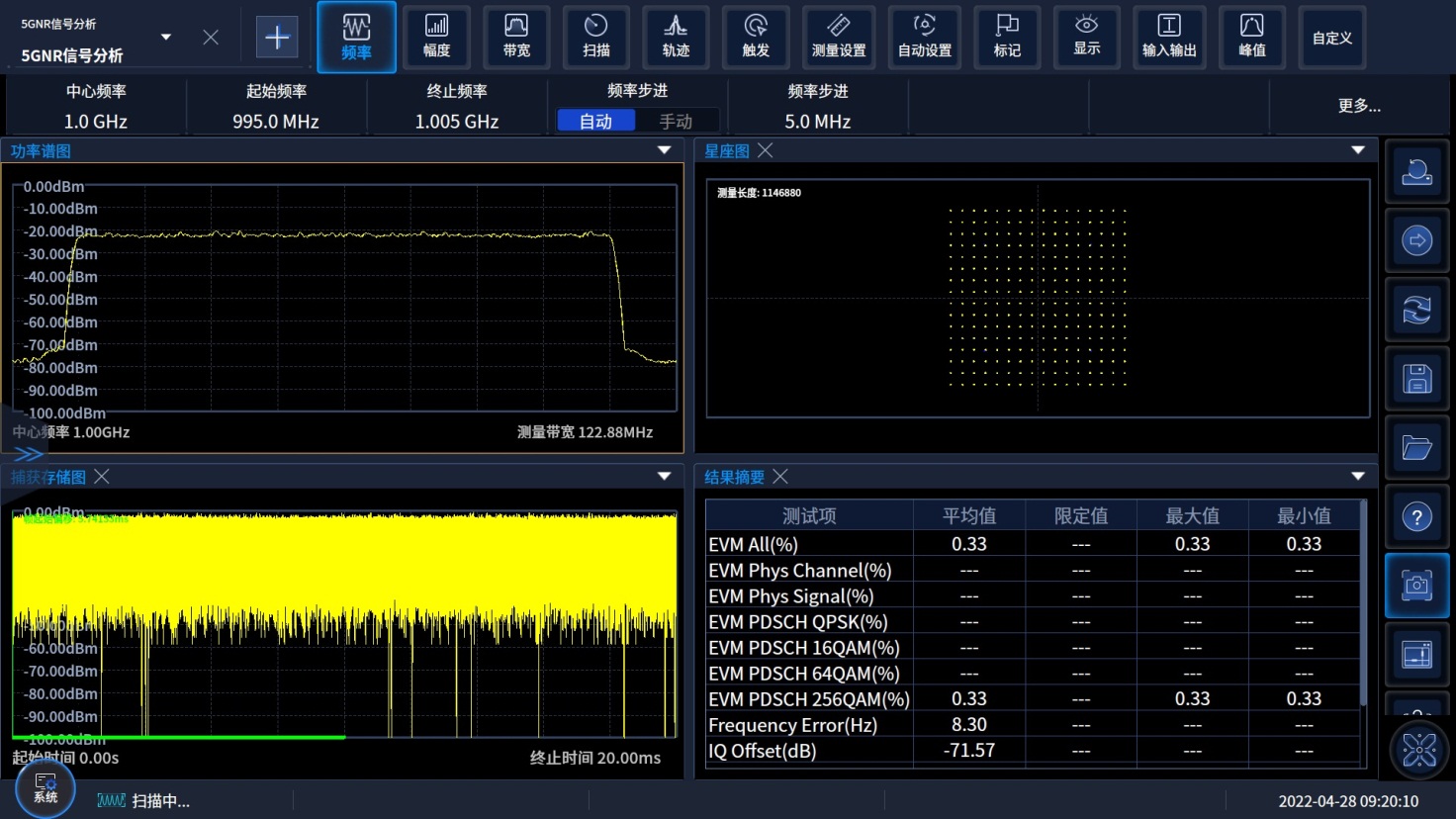 5G NR測量功能可對3GPP Rel 15和Rel 16版本的5G NR上行和下行信號進行帶內解調分析,支持FDD、TDD兩(liǎng)種雙工模式,支持QPSK到256QAM調製格式,支持Test Model和自定義參數設(shè)置,支持提供不同信道(dào)和信號的誤差矢量幅(fú)度(EVM)、頻率誤差和功率等測量結果,具備星座圖、誤(wù)差總結表、資源分配等多種顯示圖譜。