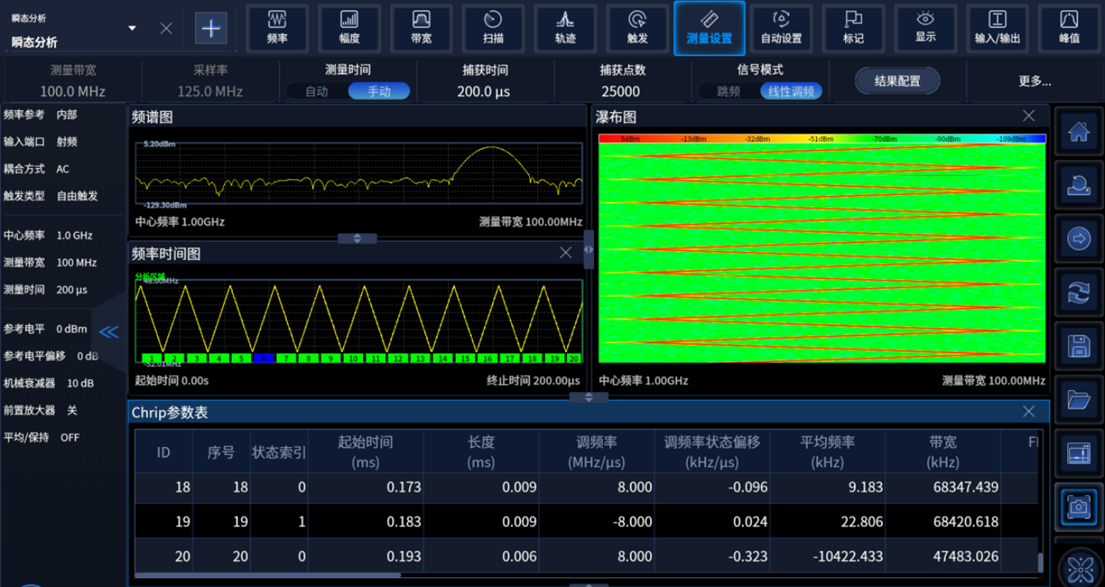 瞬態信號分析功能可以對捕獲數據的IQ幅度、相位、頻率以及功率等參數進行分析,也(yě)可以對跳頻信號、調頻連續波信號進行自動(dòng)分(fèn)析得到參數結(jié)果。