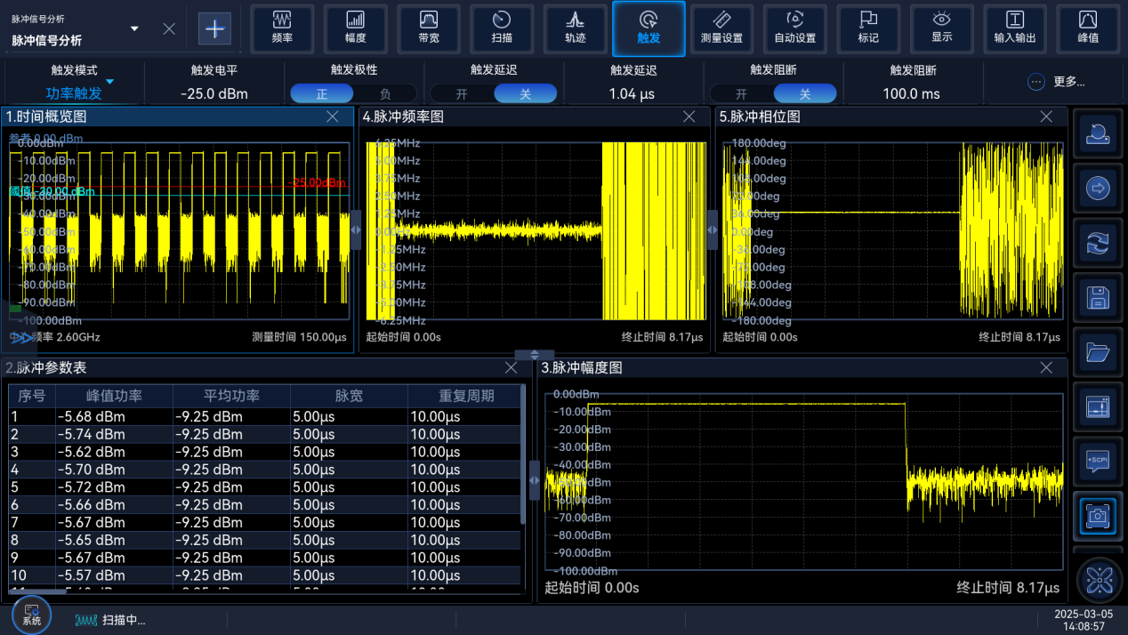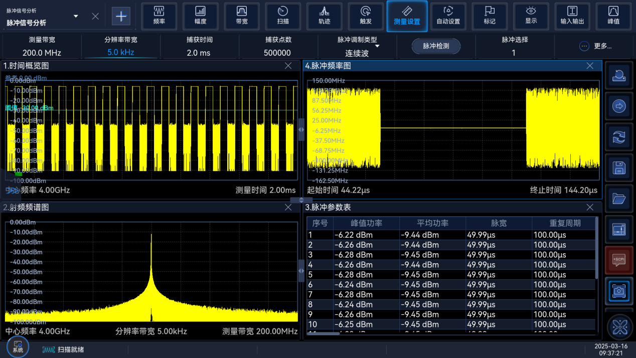 脈衝(chōng)信號(hào)分析功能選件(jiàn),可對脈衝調製(zhì)信(xìn)號進行多層次的測量(liàng)分析,並以(yǐ)頻譜、時間圖譜、參數表等(děng)多(duō)種顯示方式展現,輔助進行係統性能衡量和問題定位。