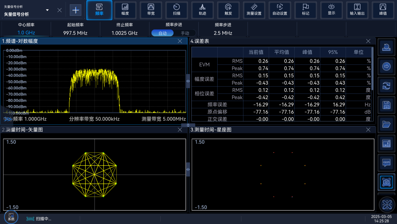 同時顯示解調(diào)前、解調後、參考信號、符號(hào)和各種誤差結果,支持頻譜(pǔ)圖、星座圖、矢量圖、相位軌跡圖、眼圖、誤差(chà)/符號表等(děng)多種顯示(shì)窗口,結果和表(biǎo)現形式豐富。
