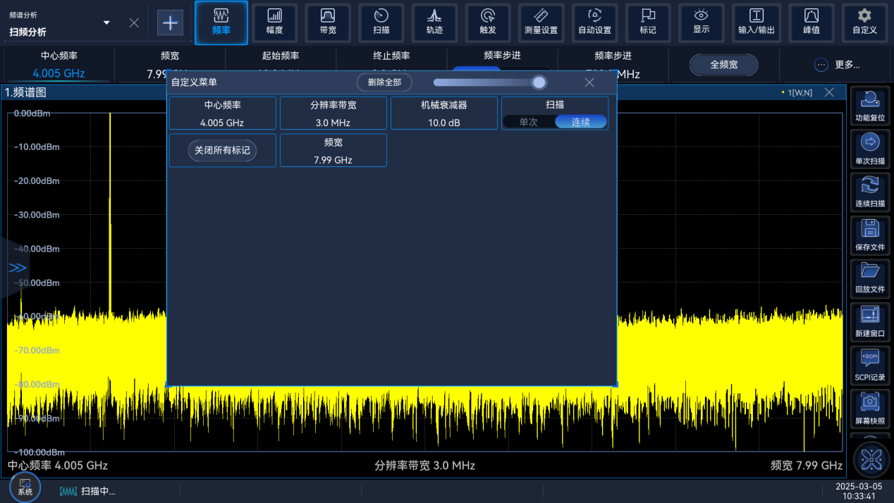 Ceyear 4071最大(dà)200MHz的瞬時分(fèn)析帶寬,可提供10MHz(標配)/40MHz/200Hz共3種分析(xī)帶寬選擇,滿足不同測試(shì)場景的應用需求。