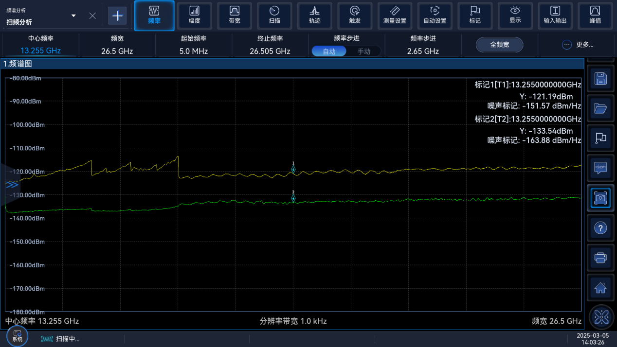 200MHz分析帶寬(kuān)下無雜散動態範圍為(wéi)-75dBc。