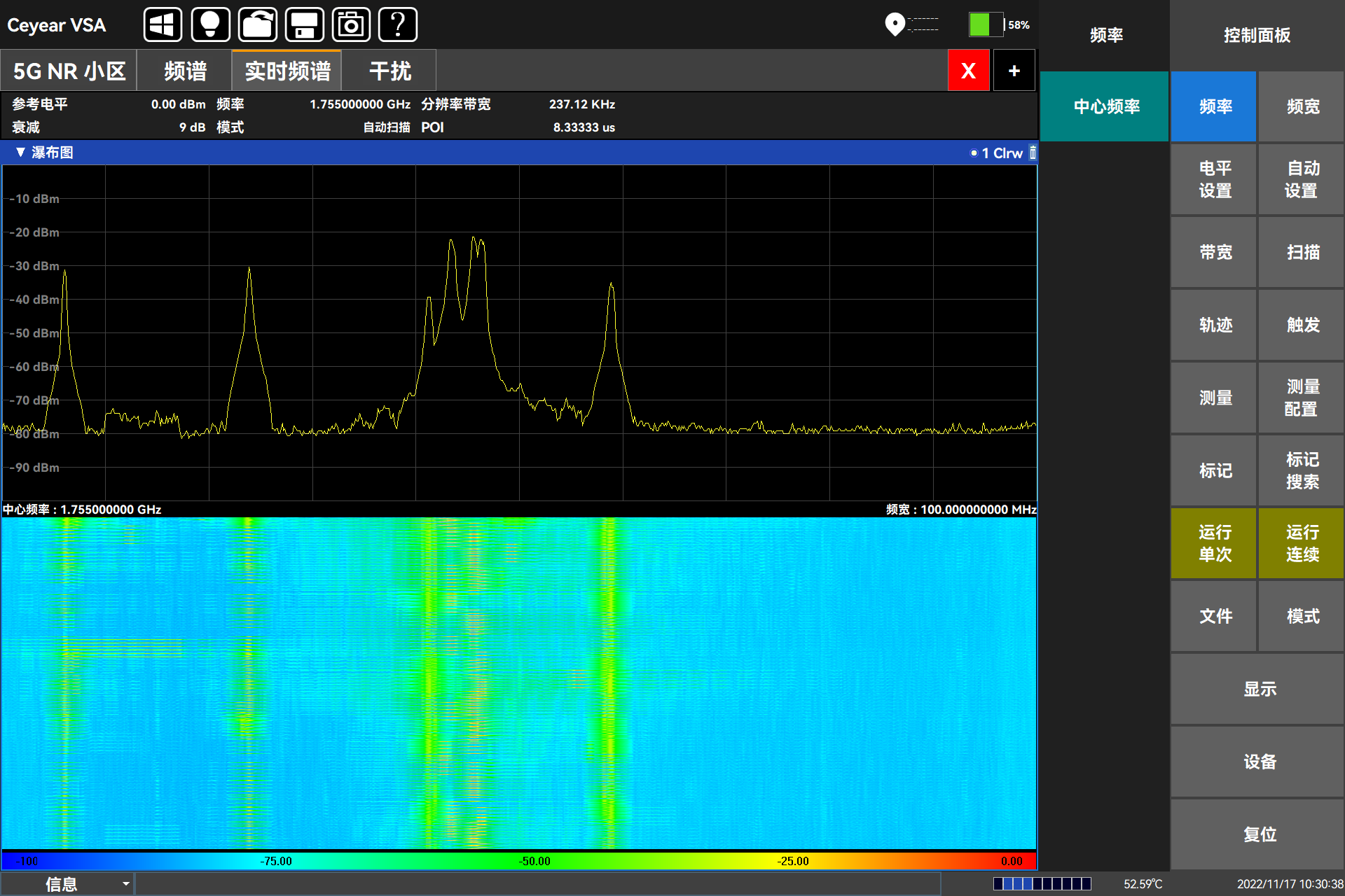 Ceyear 5252DG外場通信測試儀在幹擾分析方麵具備(bèi)全麵(miàn)的分析能力。外場通信(xìn)測試儀支持最高頻率為20GHz,具備高掃速的特點,能實時捕(bǔ)捉突(tū)發信號;外場通信測試儀內置的三維瀑布(bù)圖(tú)模式,可以(yǐ)直觀分析出被測信號(hào)頻率(lǜ)、信號特征、持續時長、幅(fú)度變化等內容;外場通信測試儀還具備餘暉頻譜分析功能,可實時捕(bǔ)獲隱藏的幹擾信號;此外,外場通信測試儀還包含信號測向、幹(gàn)擾定位、四窗幹擾排查、TDD係統幹擾排查等功能,可滿足用(yòng)戶多樣化的幹擾分析需(xū)求。